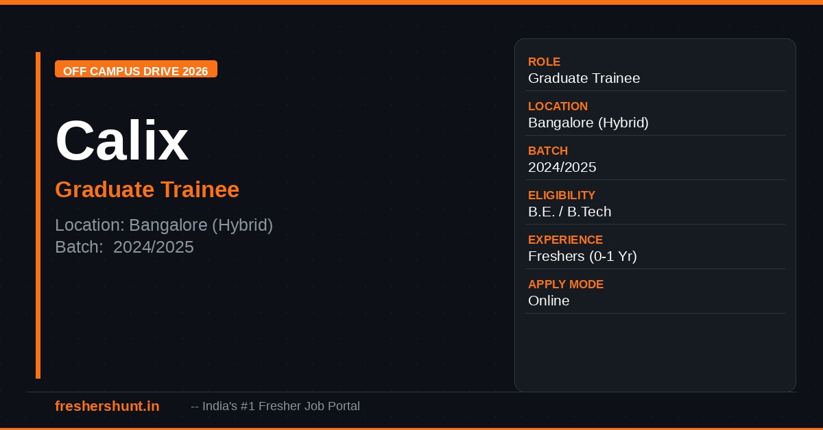 Calix Recruitment 2026 is open for Graduate Trainees! Calix is actively hiring freshers for Graduate Trainee roles in Cybersecurity and Networking for 2024 and 2025 batch graduates. This is a premium opportunity to join a leading cloud and software platform company in a hybrid role at their Bangalore office. Read on for full eligibility details and the application process.